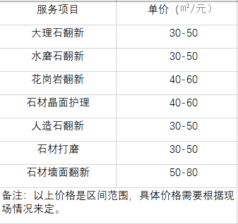 由于決定石材護(hù)理價(jià)格的因素較多,比如:石材安裝工藝如何?石材剪口大不大,也就是高低大不大等。還有與石材材質(zhì)有很大關(guān)系,同時(shí)也要看石材的材質(zhì)和石材的目前一個(gè)狀況來決定石材翻新的價(jià)格。因此價(jià)格要看實(shí)際現(xiàn)場(chǎng)才知道價(jià)格,以下給根據(jù)石材材質(zhì)情況,給出的價(jià)格參考。